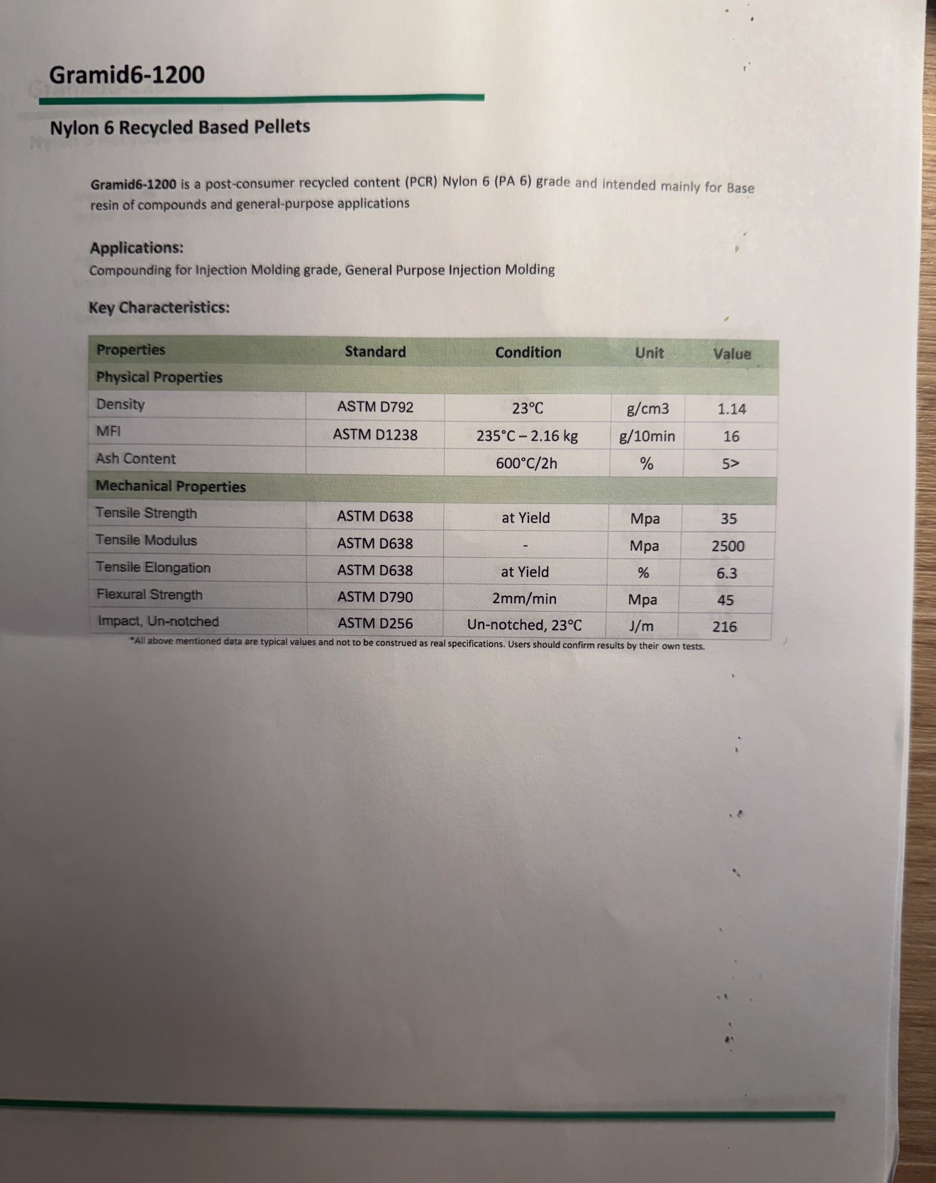 Gramid6-1200 is a post-consumer recycled content (PCR) Nylon 6 (PA 6) grade and intended mainly for Base resin of compounds and general-purpose applications
